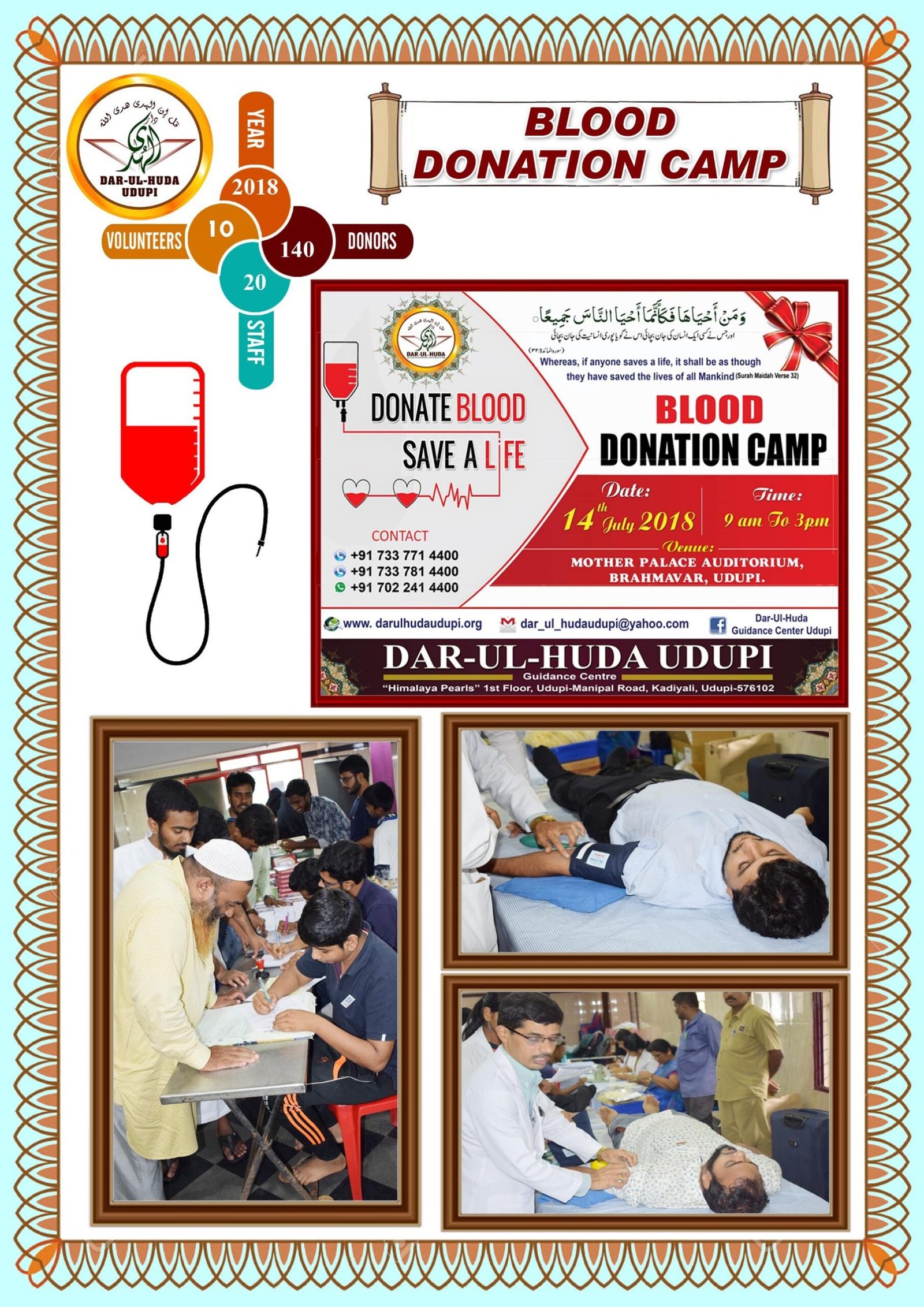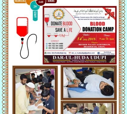 The Blood Donation Project is a life-saving humanitarian initiative organized by the Dar ul Huda Charitable Trust in Udupi, Karnataka. Driven by the spiritual principle that “saving one life is as though they have saved the lives of all mankind,” the Trust organizes community blood donation camps to support local healthcare needs. These events are held at central locations, such as the Mother Palace Auditorium in Brahmavar, to ensure maximum participation and accessibility for donors.