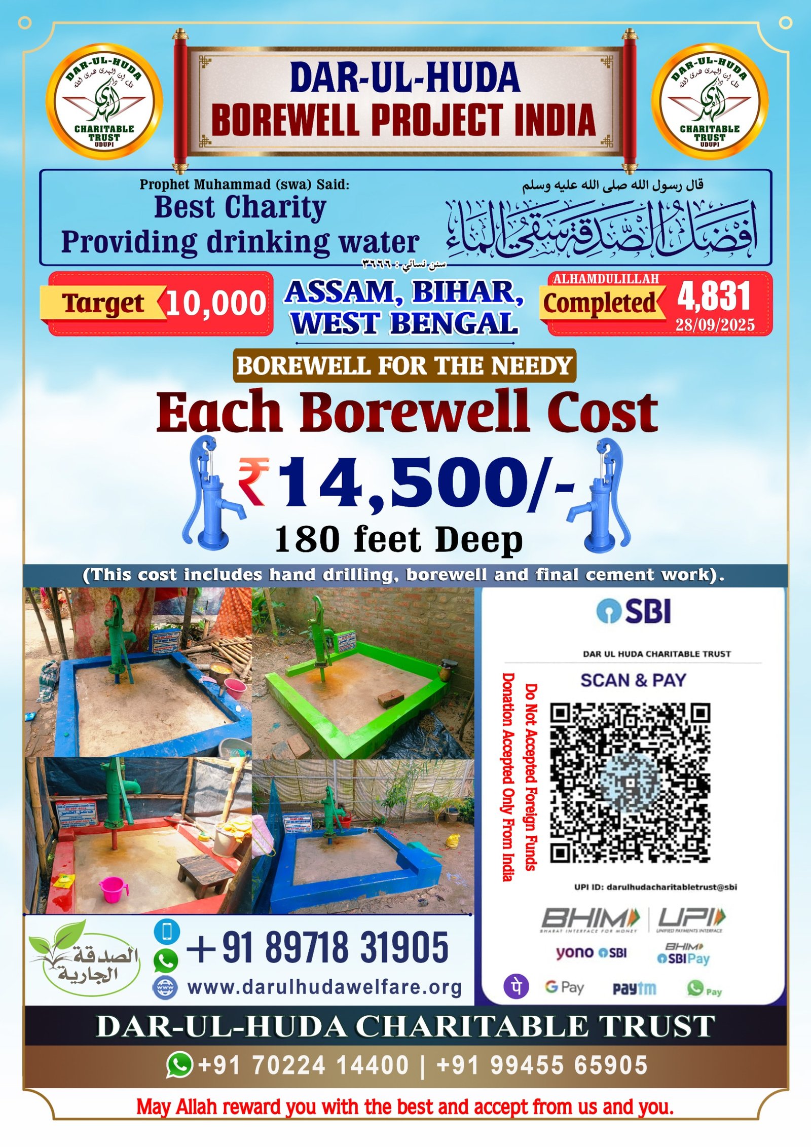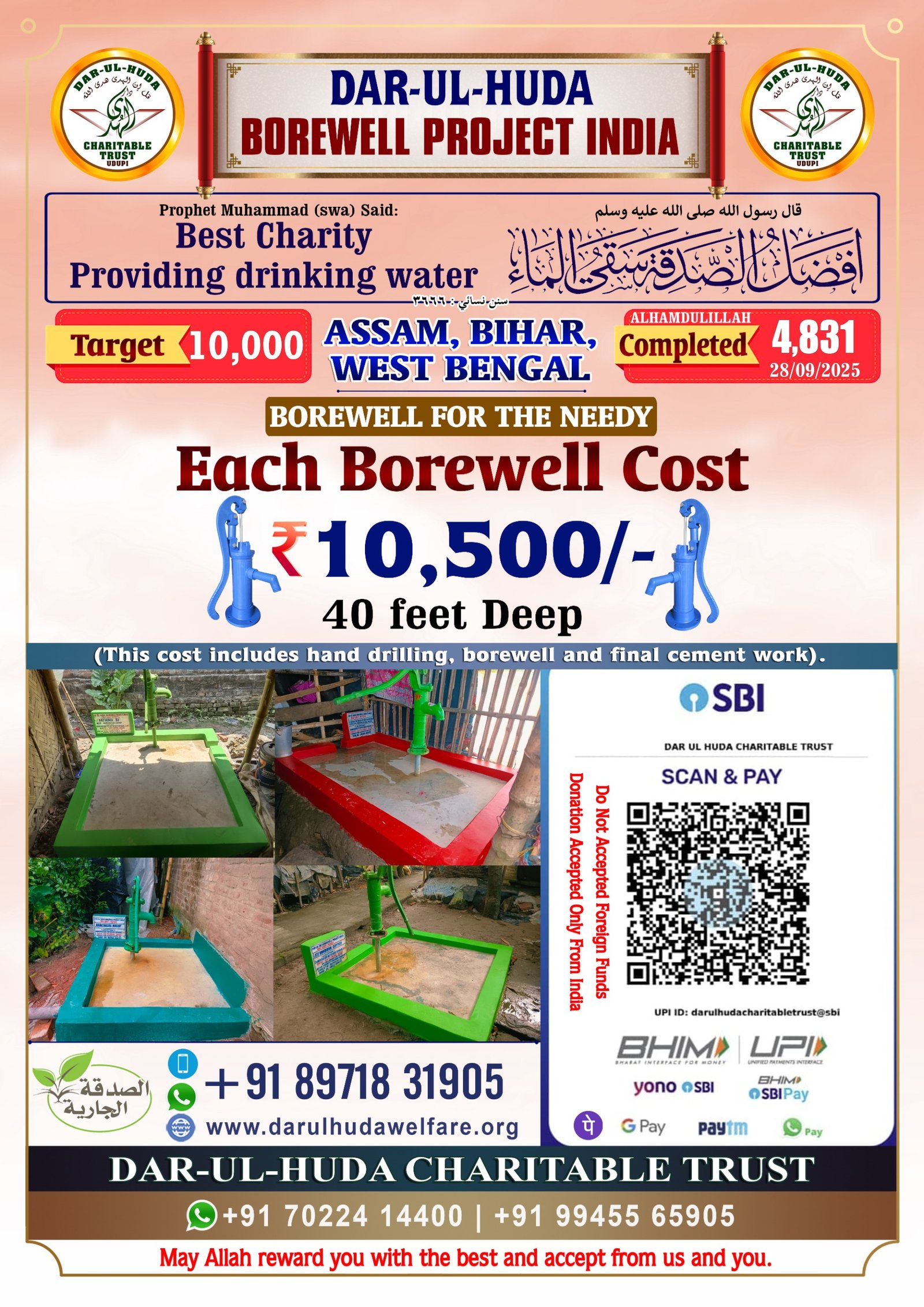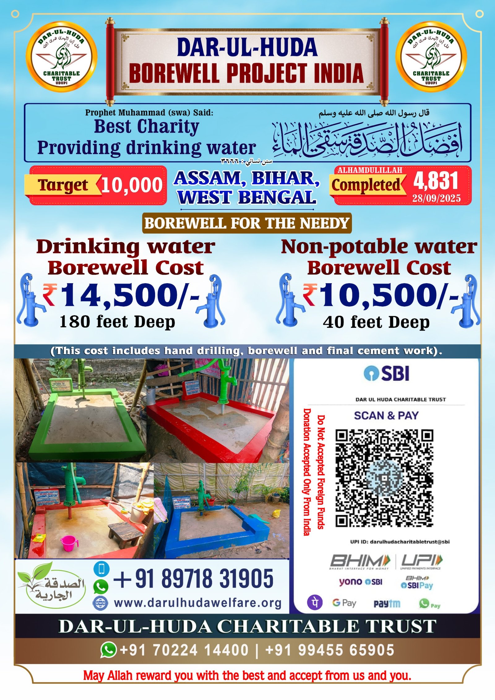 Alhamdulillah Dar ul huda Udupi Borewell ke teht ab tak 4500 Borewells Lagaye ja chuke han aur hamara irada hai ke hindustan ke mukhtalif riyasaton mein 10,000 se zayed borewells nasb kiye jayen taake peene ke saaf paani ki sahulat zyada se zyada zarurat mandon tak pahunchayi ja sake In Sha Allah !